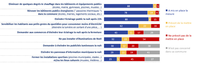 Les mesures les plus répandues sont la diminution du chauffage dans les bâtiments publics l’extinction de l’éclairage public après 22h et la rénovation énergétique des bâtiments de la commune : ces trois mesures touchant aux principaux postes de dépenses énergétiques.