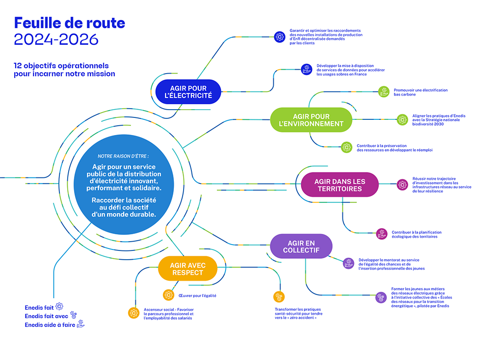 Il s’agit de partir de la raison d’être « Agir pour un service public de la distribution d’électricité innovant, performant et solidaire. Raccorder la société au défi collectif d’un monde durable » et des 5 objectifs de mission « agir pour l’électricité, pour l’environnement, dans les territoires, en collectif, avec respect » inscrits de manière pérenne dans les statuts d’Enedis, et d’en déduire des objectifs opérationnels ainsi que des indicateurs de performance permettant à Enedis de suivre et de mesurer, entre 2024 et 2026, la mise en œuvre de sa mission et les progrès réalisés dans la maximisation de ses impacts positifs.