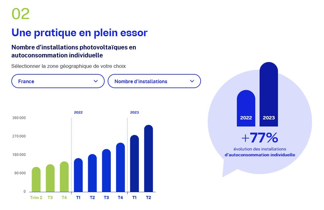 La France compte désormais 325 939 autoconsommateurs individuels, ce qui représente une hausse de 77 % entre 2022 et 2023. Un phénomène en très nette accélération.