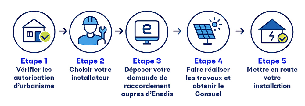 Autorisations d’urbanisme, choix d’un installateur certifié, demande de raccordement Enedis, travaux, Consuel, puis mise en service.